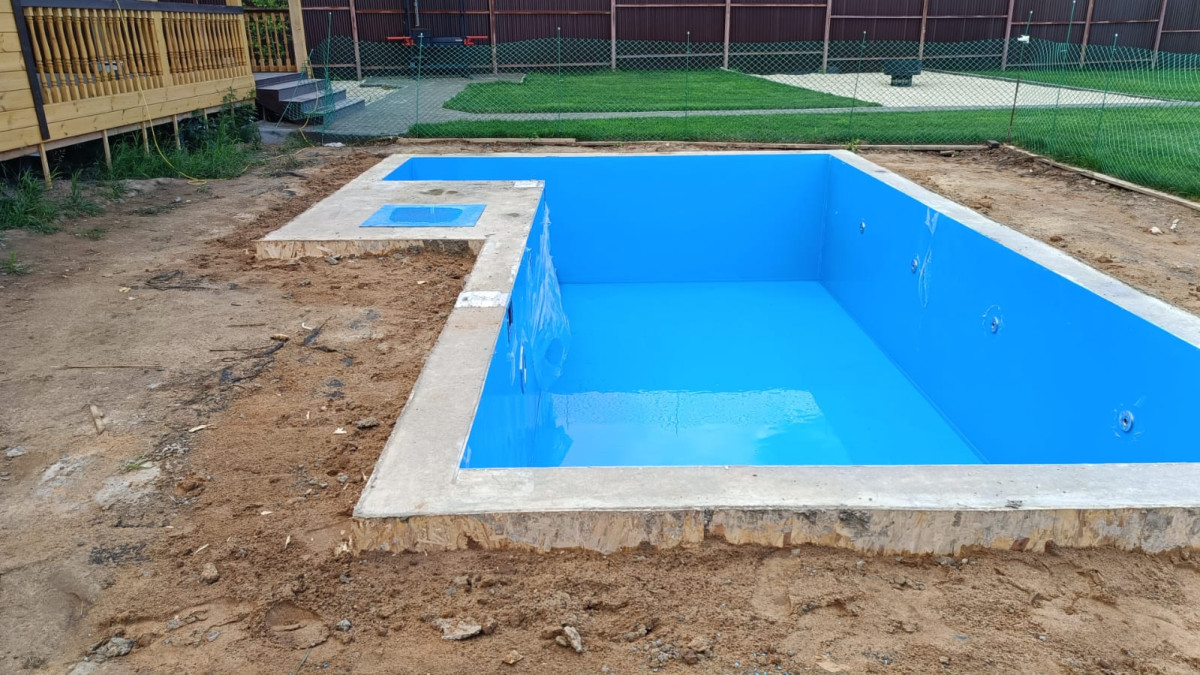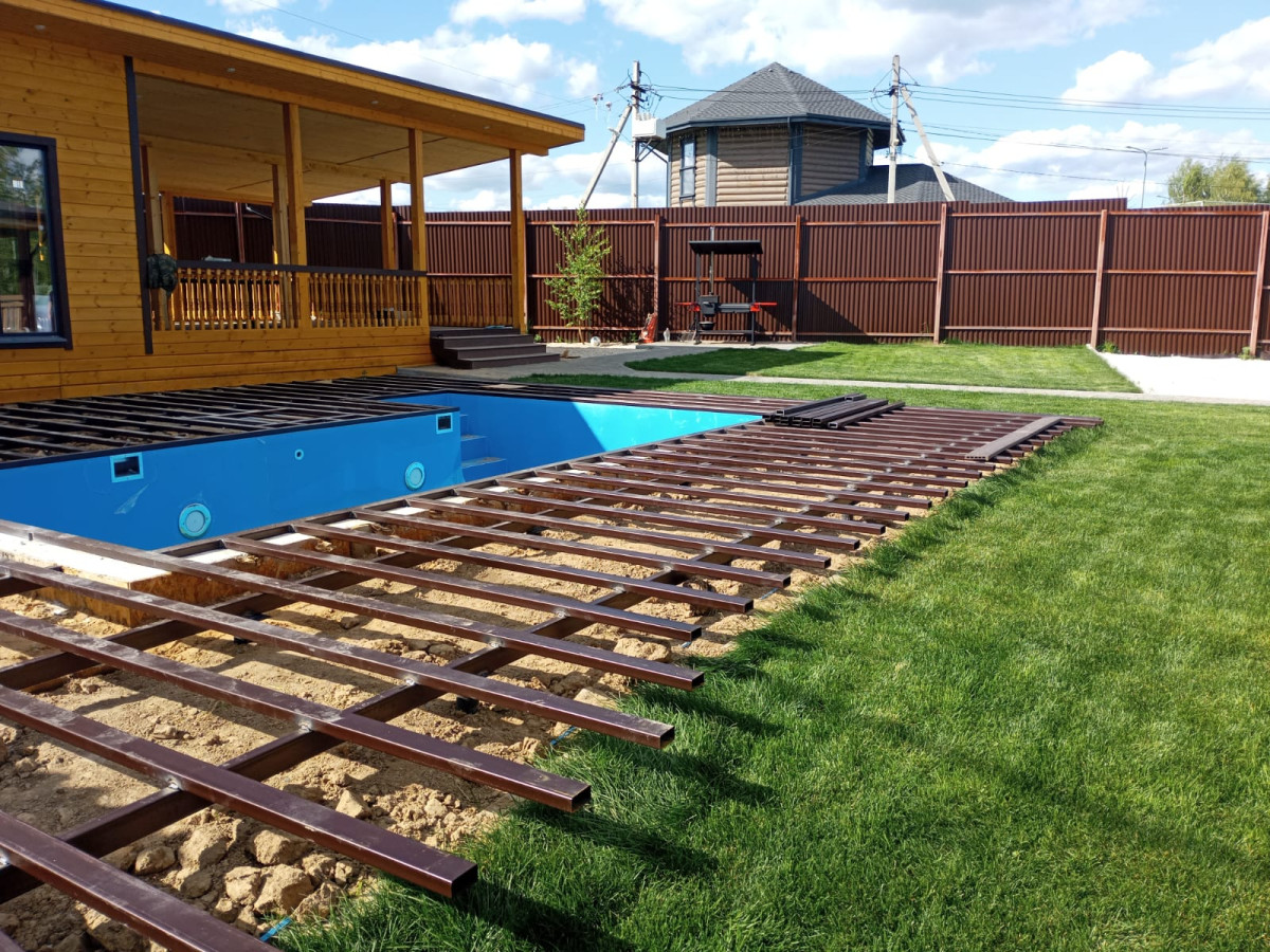 Смонтирован настил у бассейна (металлокаркас на сваях). Торцы зашиты доской. По периметру отделка ступенью шириной 165 мм.