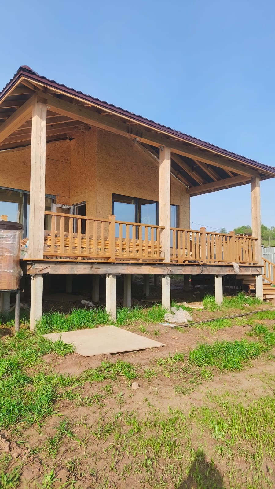 На каркас из бруса установлен металлопрофиль и смонтирована доска. По периметру отделка ступенью шириной 165 мм. Сделаны ступени и ограждение.